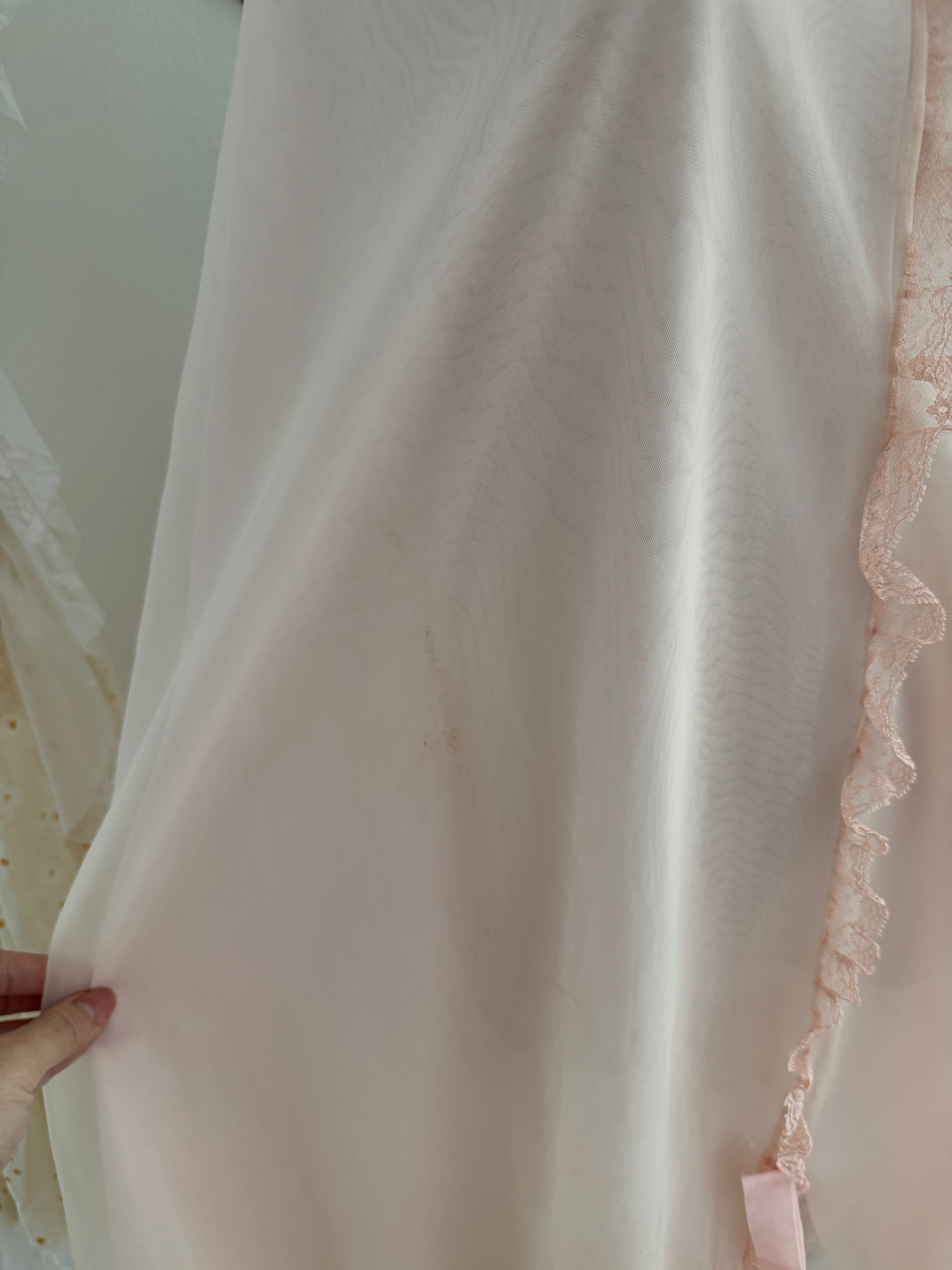 Made entirely of soft chiffon fabric in pastel yellow lined with nylon in the same shade and beautiful pleated trim detail at the neck line. Tag is cut but it is a vintage American brand. Dress is see through because the material is thin!!!It is a nightgown, not a casual summer dress, you can wear it outside but consider layering. Fit best size S