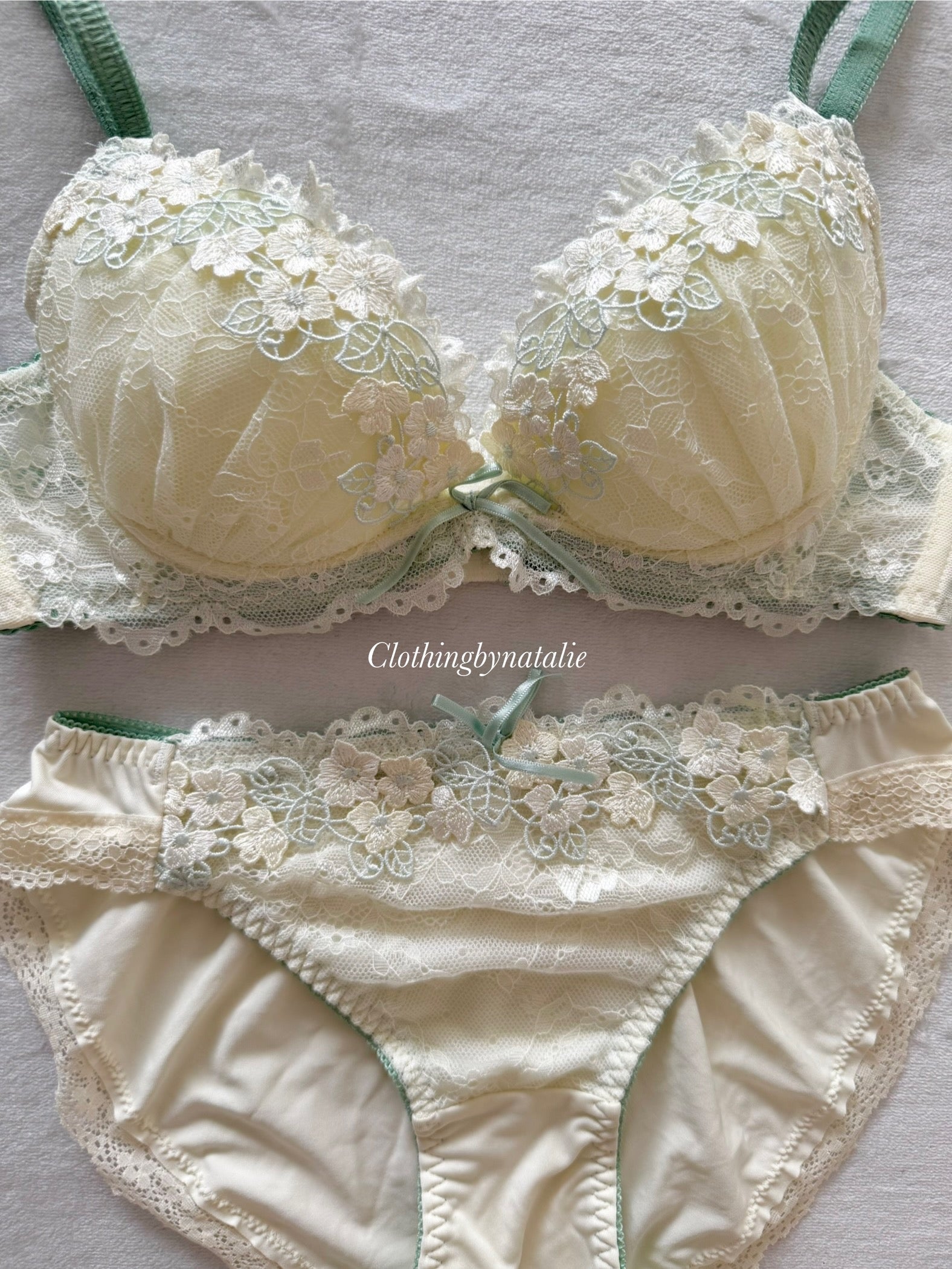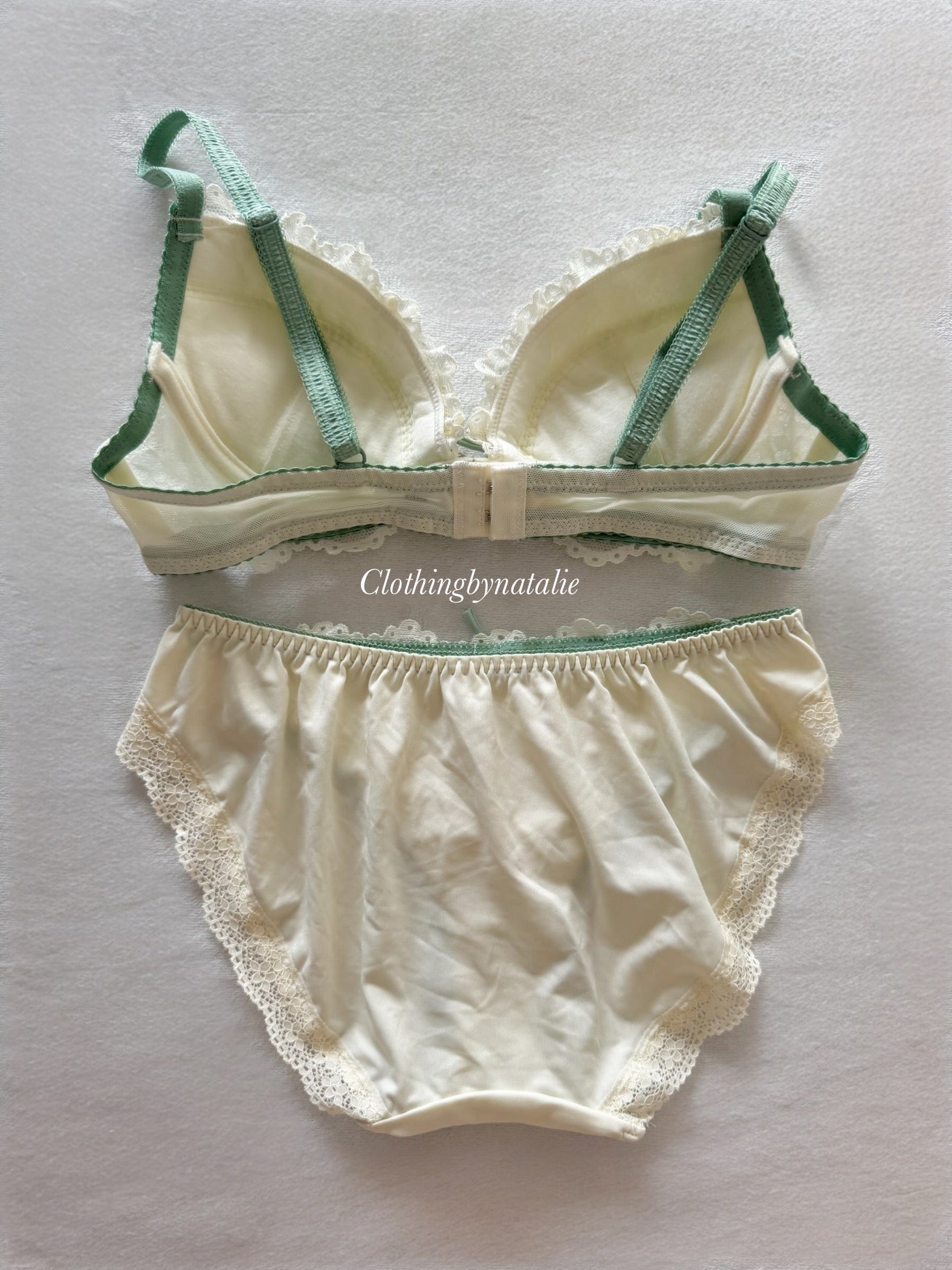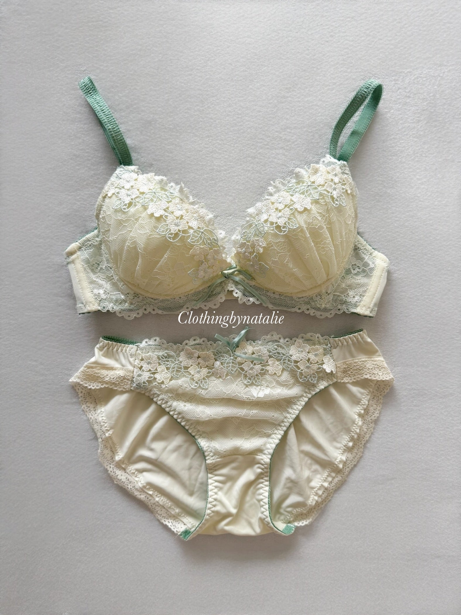 Bra: made of stretchy fabric in green with dainty embroidery floral details and lace. Straps are stretchy & adjustable with 2 hook and eye closure. Cups have removable push up pads and underwires. Fit size 70B, bust max 83cm.